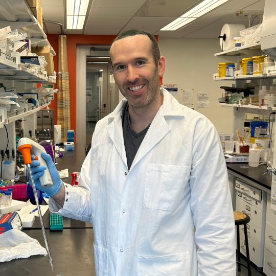 John is a Biology PhD student in the Hougland Lab. The Hougland Lab studies post-translational modifications with a focus on prenylation and the enzyme Ghrelin O-acyl transferase (GOAT). GOAT catalyzes the acylation of the peptide hormone ghrelin with octanoyl-CoA. This reaction replaces an OH groupgound on ghrelin with an 8-carbon-containing group. GOAT and ghrelin play roles in many physiological pathways and processes, including appetite stimulation, glucose homeostasis and cardiovascular health. John’s research focuses on solubilizing GOAT and investigating its presence and activity within extracellular vesicles. Work in these areas has the potential to reveal the chemical properties responsible for GOAT’s structure and function as well as expand our understanding of how GOAT contributes to physiological processes. Click here to check out the Hougland Lab.